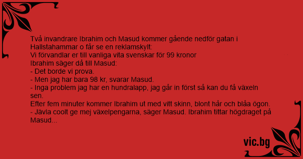 Två invandrare Ibrahim och Masud kommer gående nedför gatan i Hallstahammar o får se en reklamskylt:
