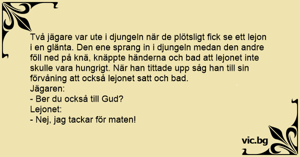 Två jägare var ute i djungeln när de plötsligt fiск se ett lejon i en glänta. Den ene sprang in i djungeln medan den andre föll ned på knä, knäppte händerna och bad att lejonet inte skulle vara hungrigt. När han tittade upp såg han till sin förvåning att också lejonet satt och bad.