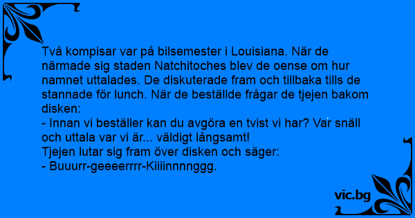 Två kompisar var på bilsemester i Louisiana. När de närmade sig staden Natchitoches blev de oense om hur namnet uttalades. De diskuterade fram och tillbaka tills de stannade för lunch. När de beställde frågar de tjejen bakom disken: