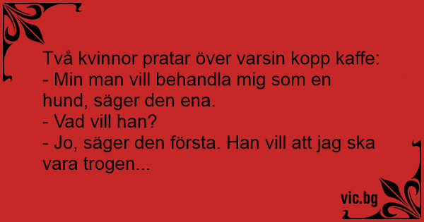 Wie ein Hund behandelt Защо се разведе с мъжа си? - Мамо, реших да напусна мъжа си. Отнася се с мен като с куче - Зашто се разведе од маж ти? En el Juzgado:,- Pero señora ¿por qué se quiere divorciar? ,- Mi marido me trata como a un perro.,- ¿Le pega, la maltrata? ,- NO, quiere que le sea fiel!! — Diga-me, por que motivo você quer divorciar-se de seu esposo? — Meu marido me trata como se eu fosse um cão! — Ele te maltrata? Te bate? — Não, quer que eu seja fiel! -Dígame ¿Cuál es el motivo por el quiere divorciarse de su esposo? - Mi marido me trata como si fuera un perro. - ¿La maltrata... le pega? - ¡No! ¡Quiere que le sea fiel! Una mujer le cuenta a su amiga que va a separarse de su marido. Frente a tal situación la amiga le pregunta: “¿Cuál es el motivo por el cual quieres separarte?” Y sin titubear, la mujer respondió:... Durante una causa di separazione il giudice cerca di convincere una signora a rinunciare al divorzio, ma lei è irremovibile. Alla richiesta del perchè di tanta ostinazione la signora dichiara che... Żona zwierza się przyjaciółce: - Chcę się rozwieść. - Co się stało?! - Mąż mnie traktuje jak psa! - Bije cię? - Nie. Chce, żebym mu była wierna… Le juge demande : - Dites-moi, madame Martin, pourquoi demandez-vous le divorce ? - Mon mari me traite comme un chien, monsieur le juge ! - Ah ? Il vous maltraite ? Il vous empêche de sortir ? -... - Min man ville behandla mig som en hund. - Fruktansvärt, vad ville han du skulle göra då? - Jo, han ville att jag ska bli trogen... — Мамо, я вирішила піти від чоловіка, він ставиться до мене як до собаки! — І що ж він робить донечко? — Він вимагає від мене вірності! Późnym wieczorem, leżąc w łóżkach, młode dziewczyny zwierzają się sobie z problemów miłosnych. - Postanowiłam zerwać za swoim chłopakiem - mówi jedna z nich. - Traktuje mnie jak psa! - Jest ci tak... Разговарале две пријателки, а едната рекла: - Готово го оставам мажот ми! - Зошто? - Ме третира како куче, не можам повеќе да издржам! - Што, те тепа и не ти дава да јадеш? - Не па ти, туку сака да... Mais madame, pourquoi voulez-vous divorcer ? - Mon mari me traite comme un chien ! - Il vous maltraite ? Il vous bat ? - Non, il veut que je lui sois fidèle ! Il giudice alla signora: “Mi dica, perche’ vuole divorziare da suo marito?”. “Eh, signor giudice, mi tratta come un cane!”. “La maltratta, la percuote?”. “No, pretende che io sia fedele”. O femeie intră precipitată în cabinetul medicului psihiatru. - Doctore, trebuie să mă ajutaţi, soţul meu este grav bolnav: mă crede câine. - Şi cum se manifestă? - Îmi cere să-i fiu credincioasă... Sotia se plange Psihiatrului: - Sotul meu se poarta cu mine precum cu Un caine! - Cum asa? Va bate? - Nu, vrea Sa-i fiu credincioasa!