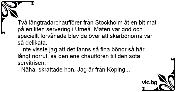 - Inte visste jag att det fanns så fina bönor så här långt norrut, sa den ene chauffören till den söta servitrisen.