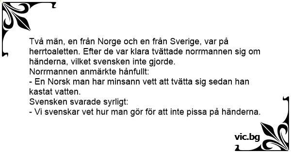 Två män, en från Norge och en från Sverige, var på herrtoaletten. Efter de var klara tvättade norrmannen sig om händerna, vilket svensken inte gjorde.