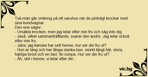 - Jaså, vilket sammanträffande, svarar den andre. Jag letar också efter min fru.