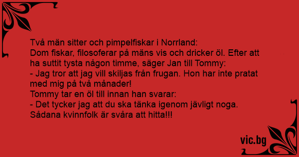 Dom fiskar, filosoferar på mäns vis och dricker öl. Efter att ha suttit tysta någon timme, säger Jan till Tommy: