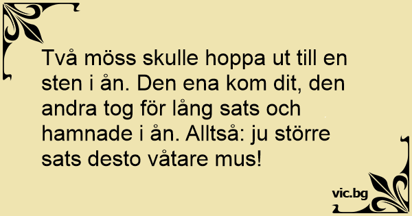 Två möss skulle hoppa ut till en sten i ån. Den ena kom dit, den andra tog för lång sats och hamnade i ån. Alltså: ju större sats desto våtare mus!