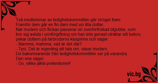När modern och flickan passerar en överförfriskad ölgubbe, som tror sig avlida i urinförgiftning om han inte genast uträttar sitt behov, pekar dottern på farbroderns kisspinne och säger: