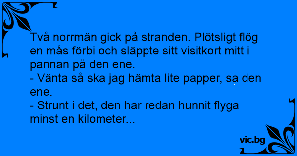 Två norrmän gick på stranden. Plötsligt flög en mås förbi och släppte sitt visitkort mitt i pannan på den ene.<br />- Vänta så ska jag hämta lite papper, sa den ene.<br />- Strunt i det, den har redan hunnit flyga minst en kilometer...