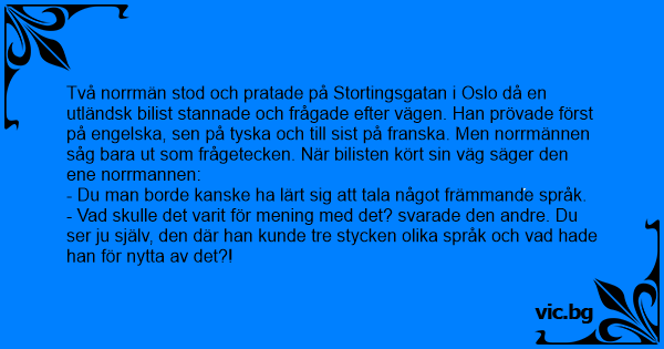 Två norrmän stod och pratade på Stortingsgatan i Oslo då en utländsk bilist stannade och frågade efter vägen. Han prövade först på engelska, sen på tyska och till sist på franska. Men norrmännen såg bara ut som frågetecken. När bilisten kört sin väg säger den ene norrmannen: