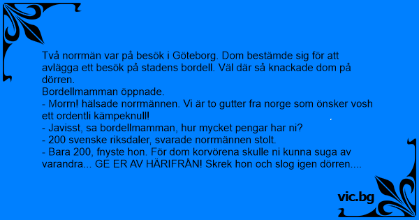 Två norrmän var på besök i Göteborg. Dom bestämde sig för att avlägga ett besök på stadens bordell. Väl där så knackade dom på dörren.