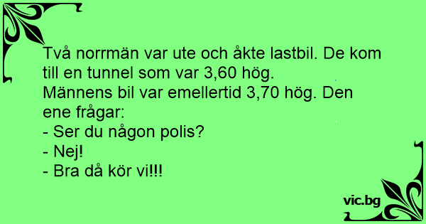 Två norrmän var ute och åkte lastbil. De kom till en tunnel som var 3,60 hög.