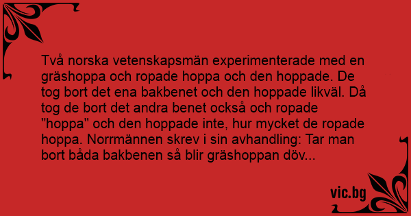 Två norska vetenskapsmän experimenterade med en gräshoppa och ropade hoppa och den hoppade. De tog bort det ena bakbenet och den hoppade likväl. Då tog de bort det andra benet också och ropade "hoppa" och den hoppade inte, hur mycket de ropade hoppa. Norrmännen skrev i sin avhandling: Tar man bort båda bakbenen så blir gräshoppan döv...
