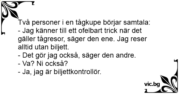 - Jag känner till ett ofelbart trick när det gäller tågresor, säger den ene. Jag reser alltid utan biljett.