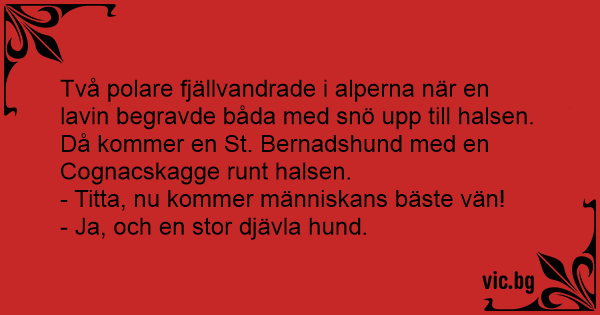 Två polare fjällvandrade i alperna när en lavin begravde båda med snö upp till halsen. Då kommer en St. Bernadshund med en Cognacskagge runt halsen.