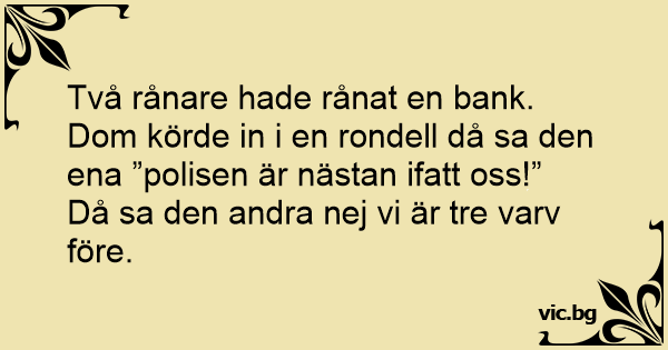 Två rånare hade rånat en bank. Dom körde in i en rondell då sa den ena ”polisen är nästan ifatt oss!”