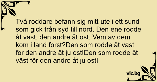 Två roddare befann sig mitt ute i ett sund som gick från syd till nord. Den ene rodde åt väst, den andre åt ost. Vem av dem kom i land först?Den som rodde åt väst för den andre åt ju ost!Den som rodde åt väst för den andre åt ju ost!