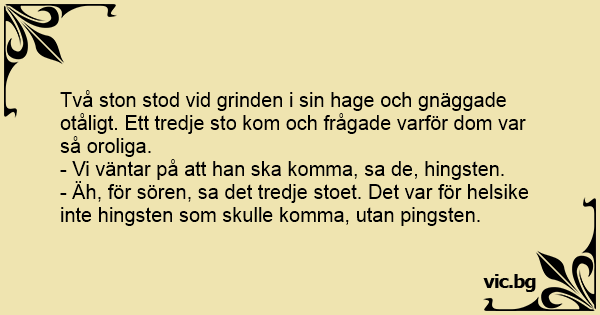 - Äh, för sören, sa det tredje stoet. Det var för hеlsiке inte hingsten som skulle komma, utan pingsten.