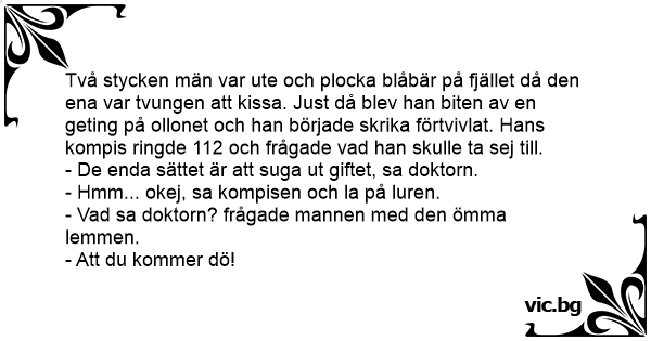 Två stycken män var ute och plocka blåbär på fjället då den ena var tvungen att kissa. Just då blev han biten av en geting på ollonet och han började skrika förtvivlat. Hans kompis ringde 112 och frågade vad han skulle ta sej till.