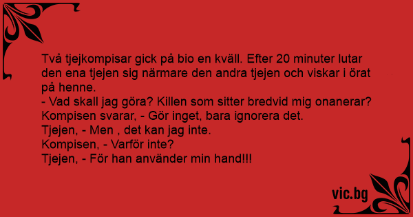Två tjejkompisar gick på bio en kväll. Efter 20 minuter lutar den ena tjejen sig närmare den andra tjejen och viskar i örat på henne.