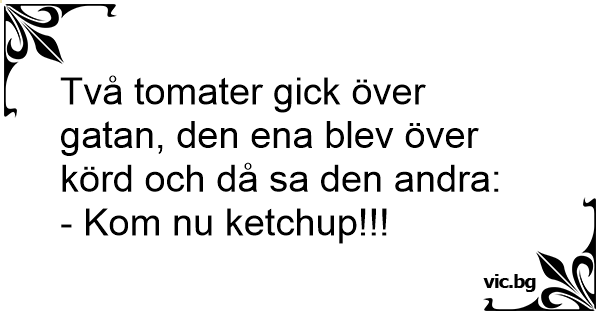 Det var en gång två tomater som var ute och gick. Dem skulle gå över en väg då det kom en bil körande. Den ena tomaten blev överkörd. Då så sa den andra tomaten: - Kom nu ketchup så går vi.