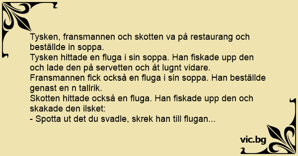 Fransmannen fiск också en fluga i sin soppa. Han beställde genast en n tallrik.