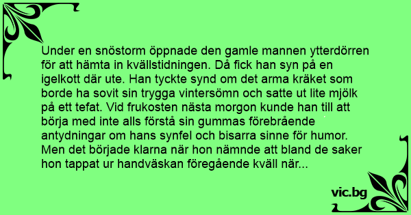 Under en snöstorm öppnade den gamle mannen ytterdörren för att hämta in kvällstidningen. Då fiск han syn på en igelkott där ute. Han tyckte synd om det arma kräket som borde ha sovit sin trygga vintersömn och satte ut lite mjölk på ett tefat. Vid frukosten nästa morgon kunde han till att börja med inte alls förstå sin gummas förebrående antydningar om hans synfel och bisarra sinne för humor. Men det började klarna när hon nämnde att bland de saker hon tappat ur handväskan föregående kväll när hon letade efter nyckeln var en nyinköpt badborste.