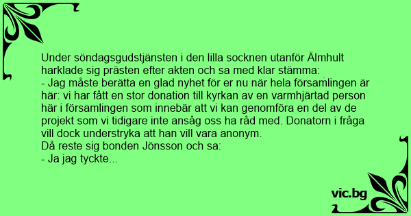- Jag måste berätta en glad nyhet för er nu när hela församlingen är här: vi har fått en stor donation till kyrkan av en varmhjärtad person här i församlingen som innebär att vi kan genomföra en del av de projekt som vi tidigare inte ansåg oss ha råd med. Donatorn i fråga vill dock understryka att han vill vara anonym.