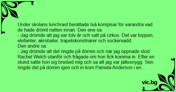 Under skolans lunchrast berättade två kompisar för varandra vad de hade drömt natten innan. Den ene sa: