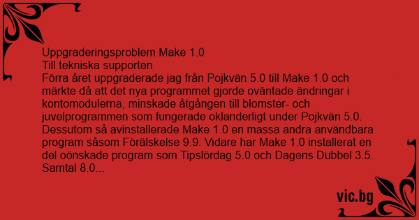 Förra året uppgraderade jag från Pojkvän 5.0 till Make 1.0 och märkte då att det nya programmet gjorde oväntade ändringar i kontomodulerna, minskade åtgången till blomster- och juvelprogrammen som fungerade oklanderligt under Pojkvän 5.0. Dessutom så avinstallerade Make 1.0 en маssа andra användbara program såsom Förälskelse 9.9. Vidare har Make 1.0 installerat en del oönskade program som Tipslördag 5.0 och Dagens Dubbel 3.5. Samtal 8.0 kan ej längre köras och Storstädning 2.6 kraschar hela systemet. Jag har, utan framgång, försökt att köra Gnäll och Tjat 5.3 för att lösa problemen.