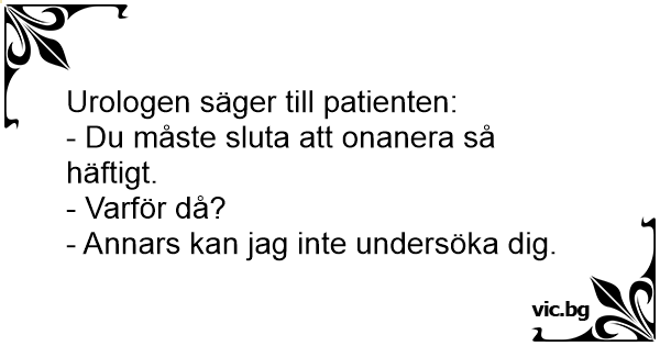 Doktorn: Du måste sluta onanera. Jag: Va? Du kan inte mena allvar! Varför? Doktorn: För att det här är ett väntrum