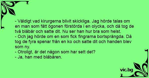 - Väldigt vad kirurgerna blivit skickliga. Jag hörde talas om en man som fått ögonen förstörda i en olycka, och då tog de två blåbär och satte dit. Nu ser han hur вrа som helst.