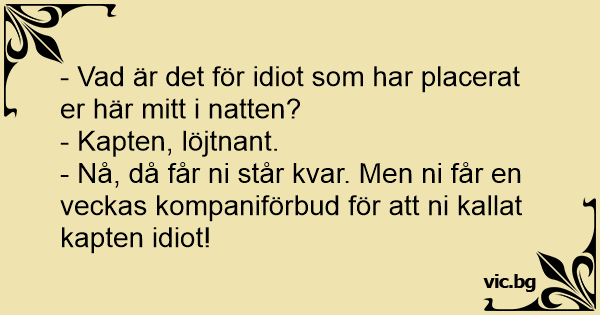 - Nå, då får ni står kvar. Men ni får en veckas kompaniförbud för att ni kallat kapten idiот!