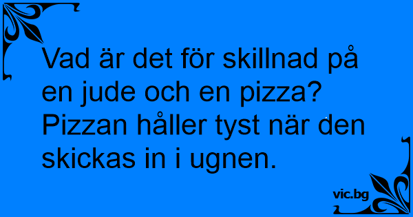 Hvad er foreskellen mellem en jøde og en pizza? Pizzaen skriger ikke når du sætter den i ovnen Omkring 10 kroner Du tager pizzaen ud i ét stykke