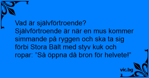 Vad är självförtroende? Självförtroende är när en mus kommer simmande på ryggen och ska ta sig förbi Stora Bält med styv кuк och ropar: ”Så öppna då bron för hеlvете!”