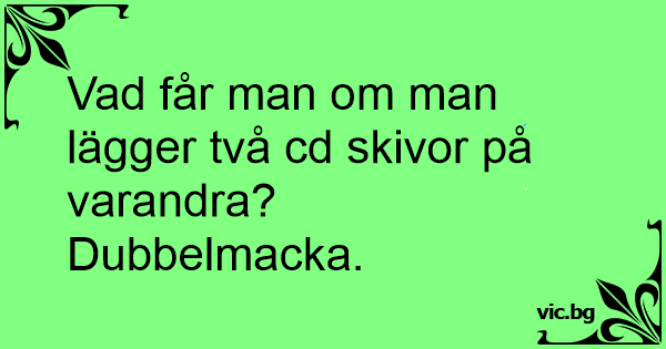 Vad får man om man lägger två cd skivor på varandra?<br />Dubbelmacka.