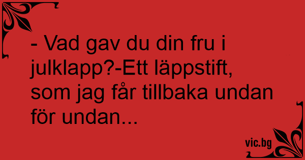 - Vad gav du din fru i julklapp?-Ett läppstift, som jag får tillbaka undan för undan... 54 0 0 Högtidsskämt