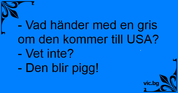 - Vad händer med en gris om den kommer till USA?<br />- Vet inte?<br />- Den blir pigg!