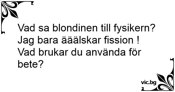 Vad sa blondinen till fysikern?<br />Jag bara ääälskar fission ! Vad brukar du använda för bete?