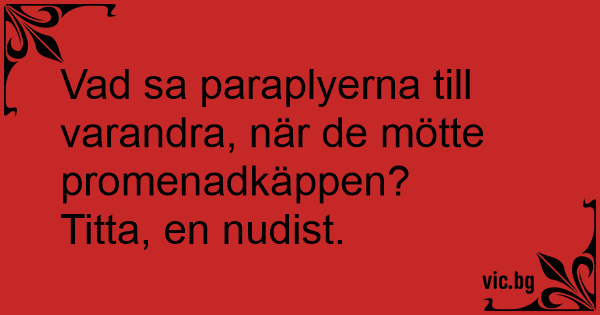 Vad sa paraplyerna till varandra, när de mötte promenadkäppen?<br />Titta, en nudist.