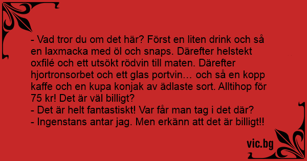 - Vad tror du om det här? Först en liten drink och så en laxmacka med öl och snaps. Därefter helstekt oxfilé och ett utsökt rödvin till maten. Därefter hjortronsorbet och ett glas portvin… och så en kopp kaffe och en kupa konjak av ädlaste sort. Alltihop för 75 kr! Det är väl billigt?