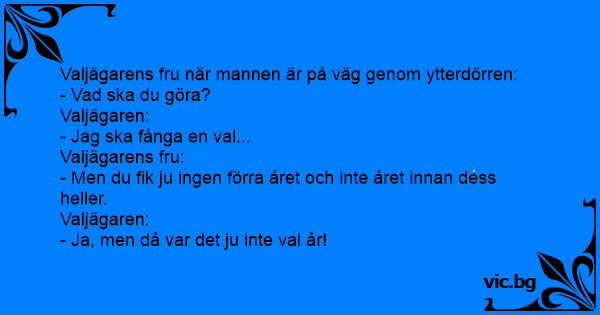 Valjägarens fru när mannen är på väg genom ytterdörren: - Vad ska du göra? Valjägaren: - Jag ska fånga en val... Valjägarens fru: - Men du fik ju ingen förra året och inte året innan dess heller. Valjägaren: - Ja, men då var det ju inte val år!