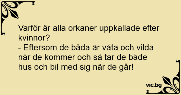 - Varför ger man tropiska orkaner kvinnonamn? - Det är för att de är vilda och våta när de kommer. Och när de försvinner tar de med sig bilen och huset...