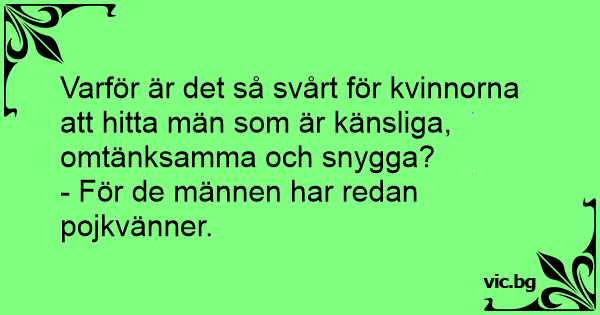 - Защо за жените е трудно да си намерят мъж, който да е грижлив, чувствителен и красив? - Защото тези мъже вече си имат любовник
