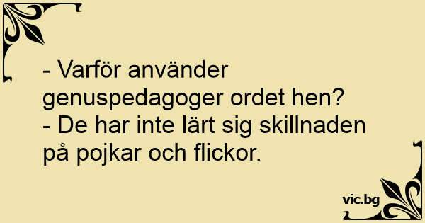 - Varför använder genuspedagoger ordet hen?<br />- De har inte lärt sig skillnaden på pojkar och flickor.
