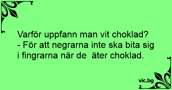 Γιατί οι αράπηδες τρώνε μόνο άσπρες σοκολάτες; Σοκολάτα Γιατί βγήκαν οι άσπρες σοκολάτες; Знаете ли защо негрите ядат само бял шоколад? Οι σοκολάτες - Знаете ли защо са измислили белия шоколад? Белый шоколад придумали для того, чтобы негритята тоже могли вымазаться. - Защо е измислен белия шоколад? - Зачем придумали белый шоколад? - Чтобы и негритятам было чем выпачкать свои мордашки! Q: Why did they invent white chocolate? A: So all black kids could get their faces messy too. Why did the white chocolate was invented? So niggers can get dirty! Hvorfor har man opfundet hvid chokolade? – Så negere ikke skal bide sig selv i fingeren – Varför säljs så mycket vit choklad i Afrika? – För att de inte skall bita sig i fingrarna. Warum hat ein Neger im Kino, wenn er Schokolade ißt, weiße Handschuhe an? Damit er sich nicht in die Finger beißt! Wieso wurde weiße Schokolade erfunden? – Damit Neger sich beim Essen nicht in die Finger beißen. – For at negerene ikke bider sig selv i fingrene når de spiser chokolade. Hvorfor har man opfundet hvid chokolade? De ce s-a inventat ciocolata alba? Pt a se murdari si copii negri la gura - Po co produkuje się białą czekoladę? - Żeby murzynek też mógł się upieprzyć.