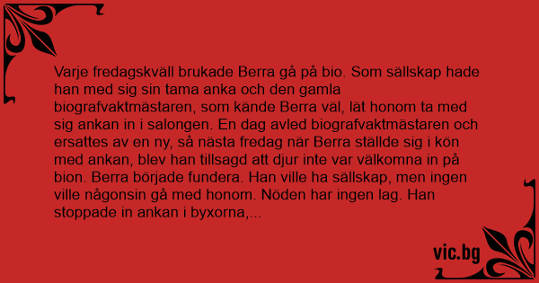 Varje fredagskväll brukade Berra gå på bio. Som sällskap hade han med sig sin tama anka och den gamla biografvaktmästaren, som kände Berra väl, lät honom ta med sig ankan in i salongen. En dag avled biografvaktmästaren och ersattes av en ny, så nästa fredag när Berra ställde sig i kön med ankan, blev han tillsagd att djur inte var välkomna in på bion. Berra började fundera. Han ville ha sällskap, men ingen ville någonsin gå med honom. Nöden har ingen lag. Han stoppade in ankan i byxorna, betalade och gick in. Efter en halvtimme i mörkret började ankan bli orolig, så Berra drog ner gylfen så att ankan kunde sticka fram huvudet, glad att få lite luft.