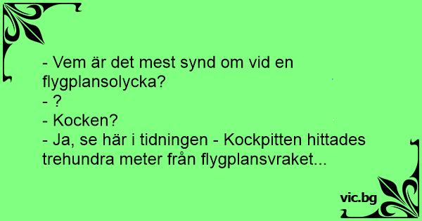 - Vem är det mest synd om vid en flygplansolycka? - ? - Kocken? - Ja, se här i tidningen - Kockpitten hittades trehundra meter från flygplansvraket...