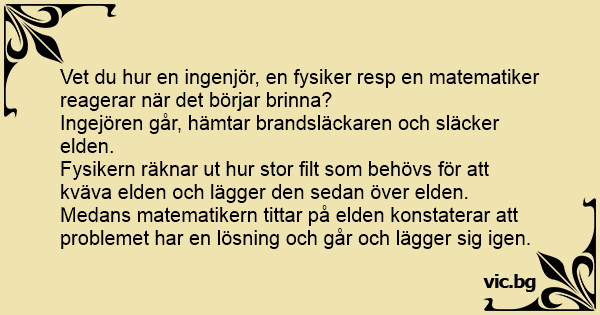 Ein Ingenieur und ein Mathematiker wachen nachts auf und merken, dass ihre Häuser brennen. Was tun sie? Der Ingenieur rennt zum Feuerlöscher, löscht damit den Brand und legt sich wieder schlafen....