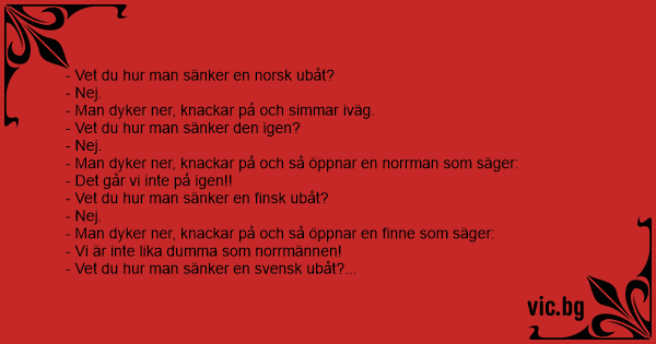 - Vet du hur man sänker en norsk U-båt ? - Nej! - Man simmar ner dit å knackar på, å öppnar dom dörren å sjunker...! Vet du hur man sänker den igen ? - Nej! - Man simmar nej dit å knackar på,...