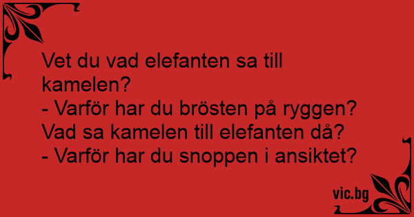 De var en kamel och en elefant. Elefanten sa till kamelen: - Varför har du dina bröst på ryggen? Då sa kamelen: - Ska du säga som har snoppen i ansiktet.