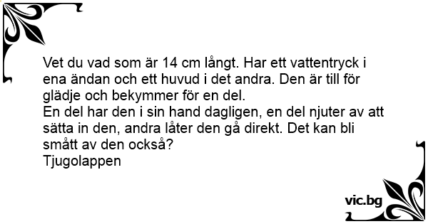Vet du vad som är 14 cm långt. Har ett vattentryck i ena ändan och ett huvud i det andra. Den är till för glädje och bekymmer för en del.